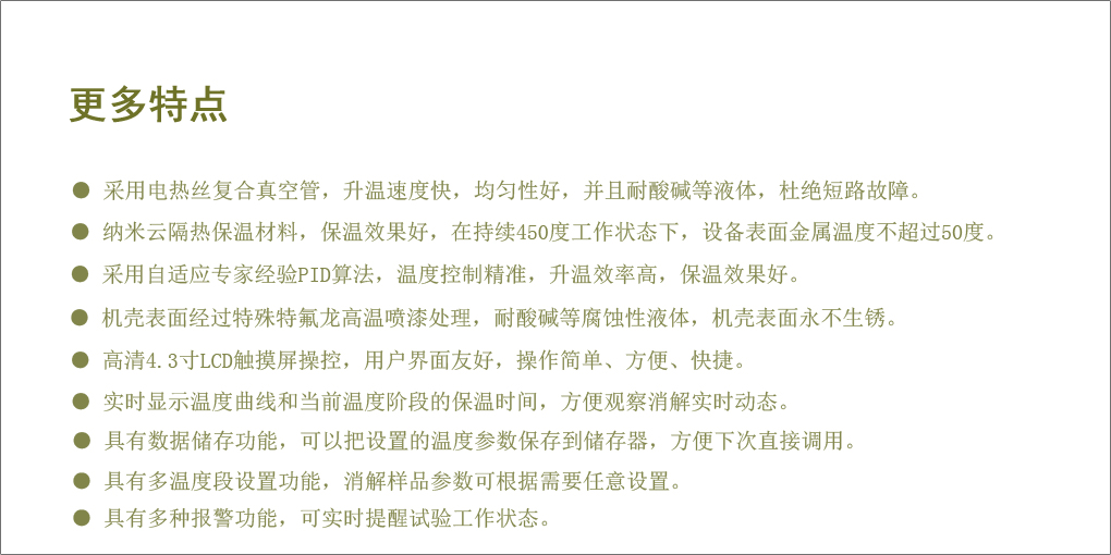 采用電熱絲復(fù)合真空加熱技術(shù),升溫效率高,溫度均勻性好。采用行業(yè)領(lǐng)先的納米云隔熱材料,熱效率高,節(jié)能環(huán)保。更具有4.3寸高清LCD觸摸屏操控界面,簡單易懂,并具實(shí)時顯示溫度曲線功能,摒棄了以往溫控表頭繁瑣的操作。 XTG5000真空電熱絲適用于食品、醫(yī)療、農(nóng)業(yè)、林業(yè)、生化等行業(yè)以及高等院校、科研部門對種子、土壤、植株、飼料、礦石等化學(xué)分析之前的樣品消解處理 |